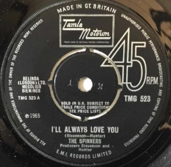 EMI’s withdrawal and renaming of the Spinners’ first two Tamla Motown singles soon increased the value of copies already in circulation. At the Clifton Record Shop in Bristol where I worked, we auctioned a copy of the first pressing of “I’ll Always Love You” for our Motown mail-order customers. According to our newsletter of the time, it was bought by “Mr. Measures of Plymouth” – although I don’t remember how much he paid. (The announcement of the winner also included a profile of the Spinners, with much of the information provided by “Mr. Gordon Cleary” of Mansfield – wherever he may be today.)